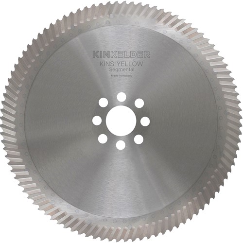 KINS' YELLOW Segmental circular saw blades feature a chrome vanadium steel body with HSS high-speed tempered steel toothed segments riveted to the periphery. This design facilitates straightforward repairs in case of tooth or segment damage by allowing the replacement of individual segments. KINKELDER has been producing segmental circular saw blades since 1972.